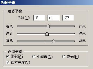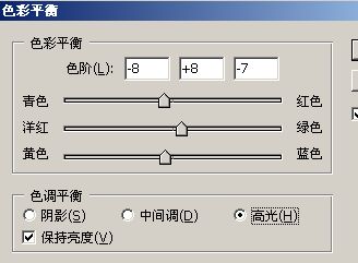 #p# 6、现在来调整色彩平衡(图像--调整--色彩平衡),分别调节阴影、中间调、高光,参数及效果如下图。