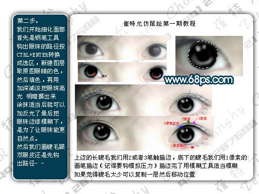 2、我们开始细化面部。首先用钢笔工具勾出眼珠的路径,按Ctrl + Ener转为选区,新建一个图层,用吸管吸取原眼睛的颜色,然后填充。再用加深/减淡工具把眼珠高光,明暗涂出来。涂抹适当后加可以加反光了。最后把眼珠边缘模糊下,是为了让眼珠能更自然点。