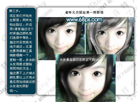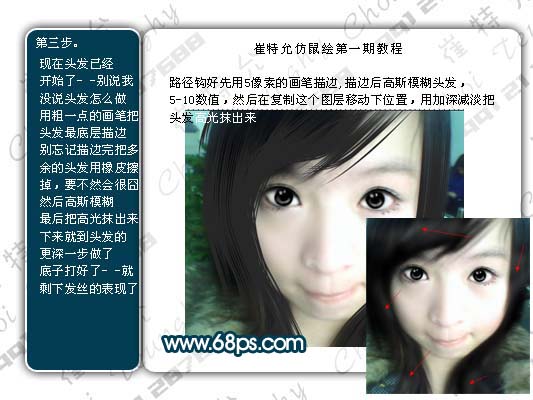 3、开始处理头发。用钢笔工具勾出路径,用粗一点的画笔描边,别忘记描边完把多余的头发用橡皮擦擦掉,要不然会很不自然。然后高斯模糊,总体处理好后,用加深减淡工具把头发高光涂出来。