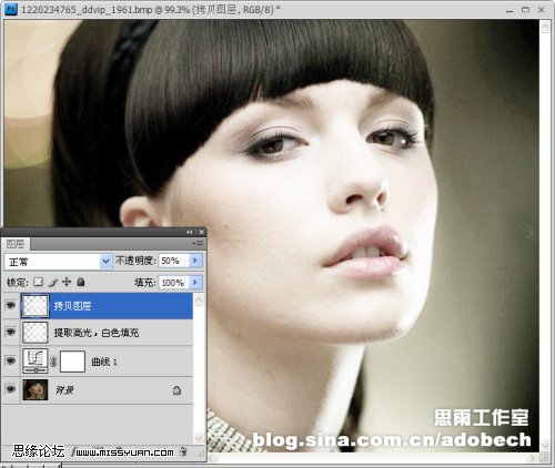 2、按Ctrl + Alt + ~调出高光选区,填充白色后,再把填充层复制一层,图层不透明度改为:50%。