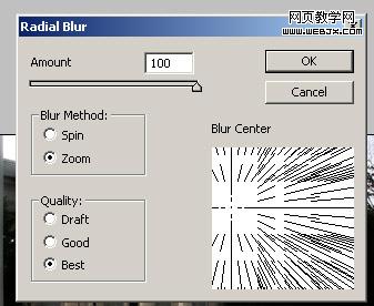 3、选择最上面的那个图层,执行滤镜——模糊——径向模糊,参数为(大小100,方式放射,质量最佳),如图;