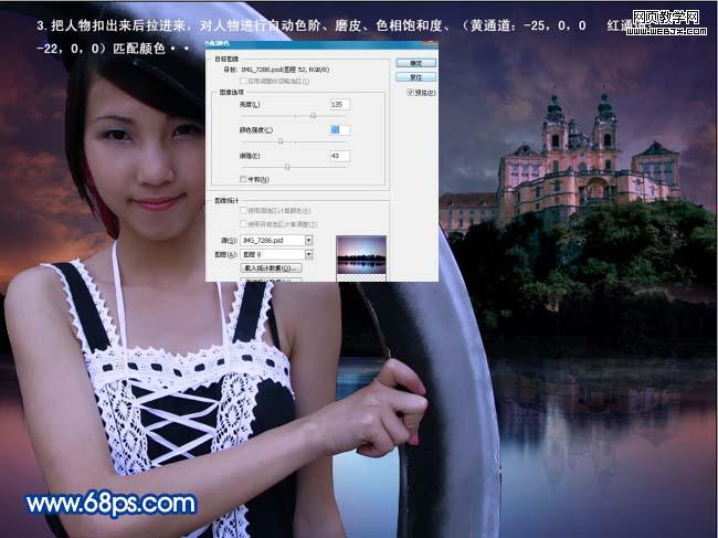 3、打开下图所示人物素材,把人物抠出来拖进来,对人物调整自动色阶、磨皮、色相/饱和度(黄通道:-25,0,0;红通道:-22,0,0),然后再执行:图像 > 调整 > 匹配颜色,跟湖面的色彩相近如下图。