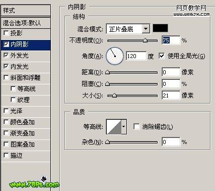 5、选中中间的图层,取消投影的样式,添加内阴影样式。