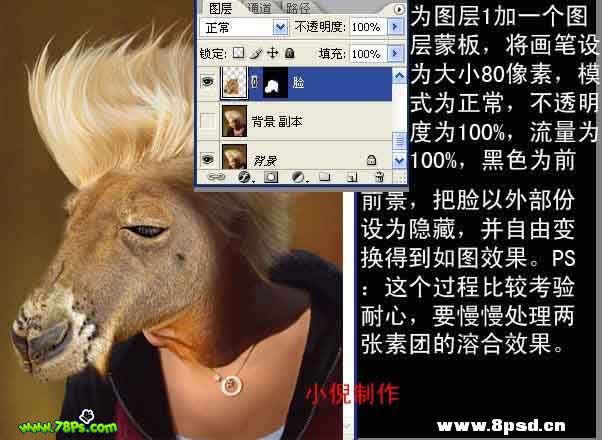 3、为图层1加上图层蒙版,将画笔设为大小80像素,模式为正常,不透明度为:100%,流量为:100%,再把前景颜色设置为黑色,然后在蒙版上把脸以外部分用画笔擦掉,然后再适当调整好大小,效果如下图。