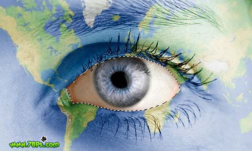 9、我们再次清除眼球区域,把刚才去色的图层载入选区,选中去色的图层执行选择--载入选区,然后按ctrl+shift+i反选,现在回到地球图层,按DEL键清除,取消选择。