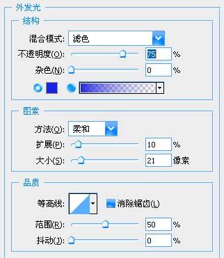 4、选择菜单:图层 > 图层样式 > 外发光,参数及效果如下图。