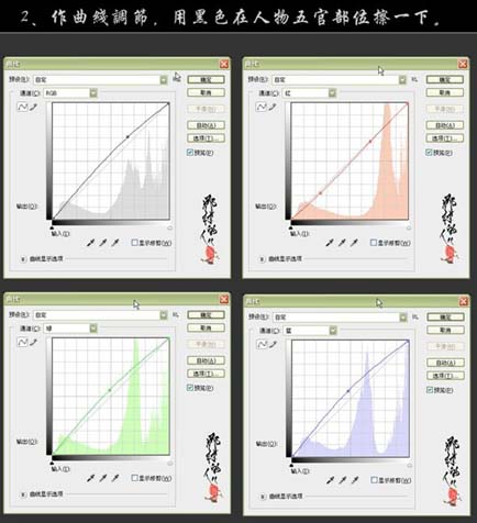 2、创建曲线调整图层,参数设置如下图,确定后用黑色画笔在人物五官部分擦一下。