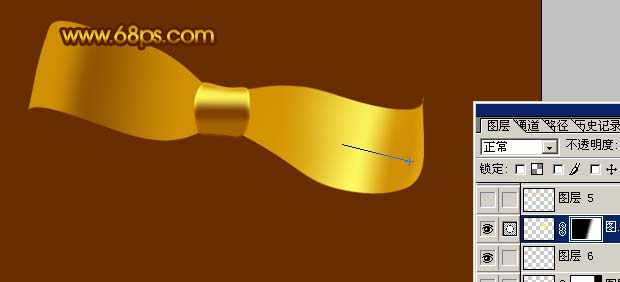 7、按Ctrl点图层面板“彩带1”缩略图调出选区,新建一个图层填充颜色:#8E4F00,取消选区后加上图层蒙版,用黑白渐变拉出图13所示透明渐变,确定后用黑色画笔把右边边缘部分稍微擦出反光效果,如图14。