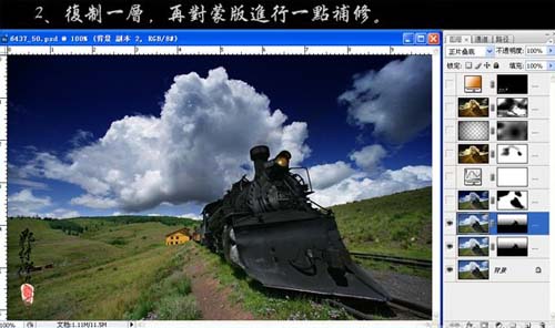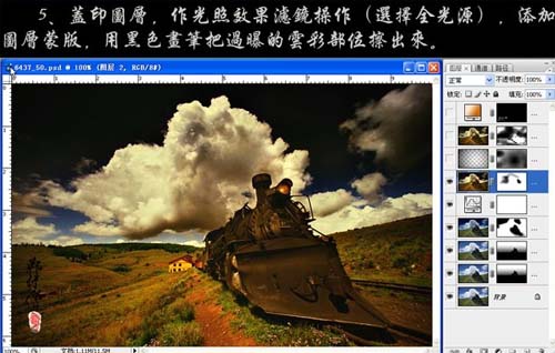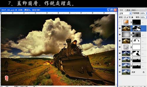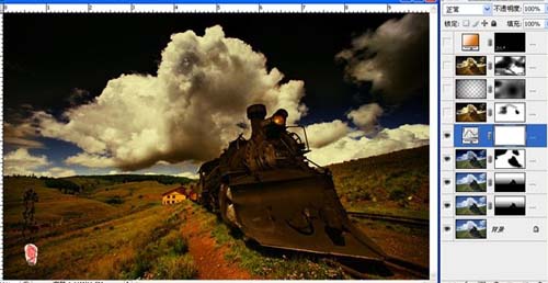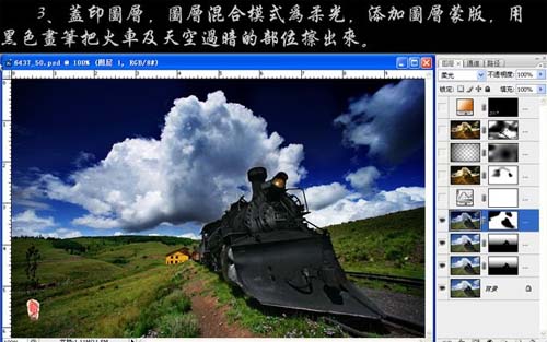 3、新建一个图层,按Ctrl + Alt + Shift + E盖印图层,图层混合模式改为“柔光”,加上图层蒙版用黑色画笔把火车及天空过暗的部分擦出来。