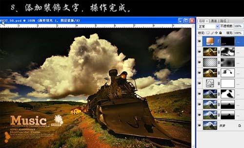 本教程的效果图有点趋向于欧美风格。大气的外景构图配上对比强烈的色调,画面视觉效果非常强烈。暗调的色彩有点怀旧的味道,也更能体现作者表达的意境。