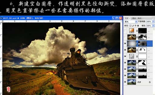 6、新建一个图层做透明到黑色径向渐变,添加图层蒙版用黑色画笔擦去一些不需要操作的部位。