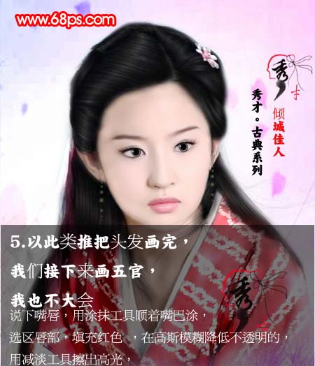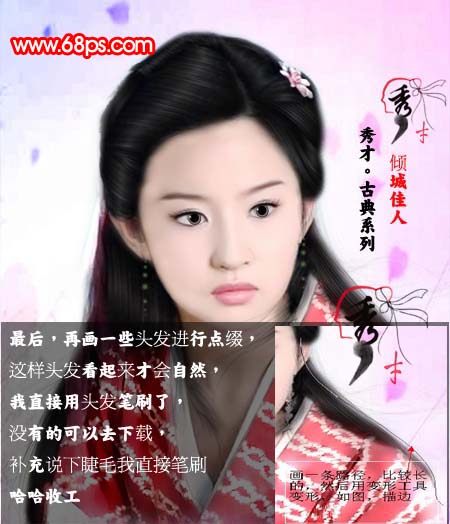 本教程跟其他转手绘教程基本类似,主体部分是人物五官及头发部分的处理。做好这一步基本手绘就没有什么难度。其它如背景及色调的调整可以任由自己发挥。