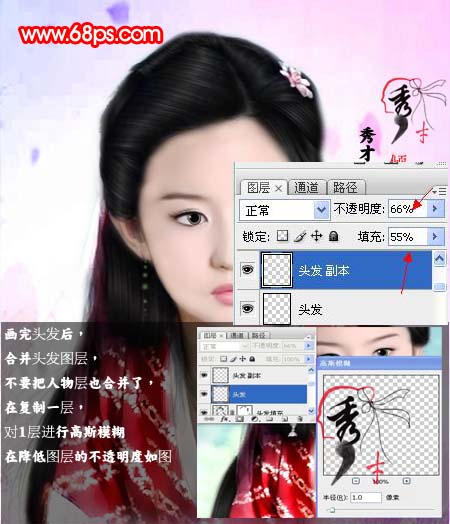 画完头发后,合并头发图层,不要把人物层也合并了。再复制一层,对1层进行高斯模糊,再降低图层的不透明度如下图。
