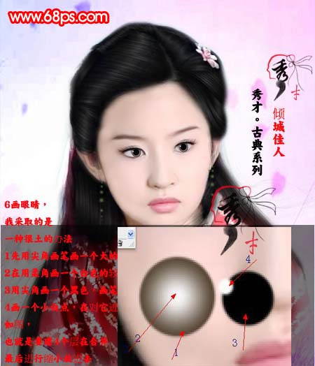 6、首先是眼睛,先用尖角画笔画一个大的圆,再用柔角画一个白色的较小的圆点,然后用尖角的点一个小白点,把几个图层组合起来即可。