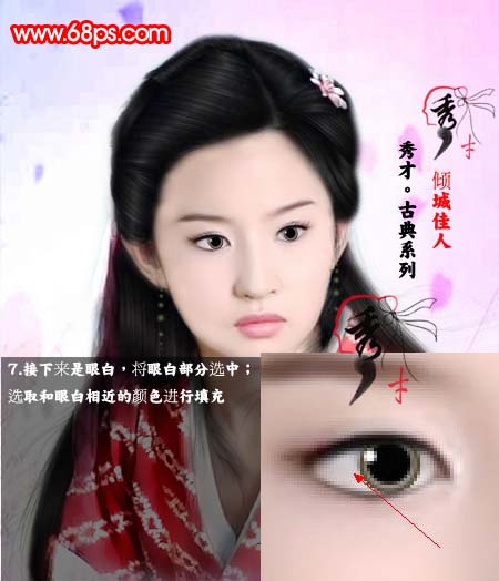 7、接下来是眼白,将眼白部分选中,选取和眼白相近的颜色进行填充。