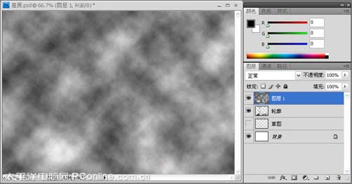12、按键盘上的D键把前景色和背景色还原为默认的颜色手,按组合键Ctrl+Shift+N新建“图层1”,执行菜单:“滤镜”/“渲染”/“云彩”,给图导添加云彩滤镜,如图12所示。