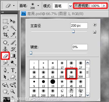 13、选择工具箱中的橡皮擦工具,橡皮擦笔尖选择为柔角,大小可结合左右中括号键进行调整,不透明秀设置为:100%,如图13所示。