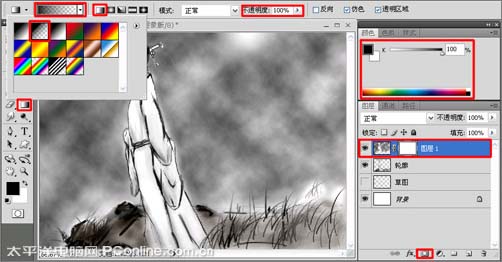 <图14> #p# 15、单击图层面板下方的添加图层蒙板按钮,给“图层1”添加图层蒙板,选择工具箱中的渐变工具,在工具选项栏上选择渐变为从前景色到透明渐变样式,选择渐变类型为线性渐变,不透明度设置为:100%,然后在颜色面板中调整渐变颜色,如图15所示。