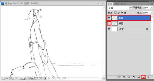 4、按组合键Ctrl+Shift+N创建新图层并命名为:轮廓,对画面的轮廓进行一步精细的刻画,然后单击“草图”图层前面的显示或隐藏图层按钮,效果如图4所示。