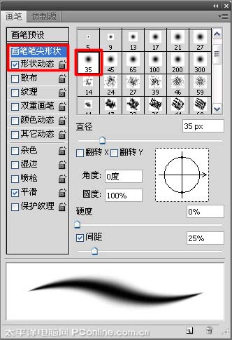 5、选择工具箱中的画笔工具后,按键盘上的F5键,弹出画笔预设面板,在“画笔笔尖形状”选择中选择柔角35像素笔尖,然后勾选“形状动态”选项,如图5所示。