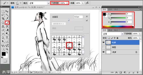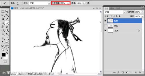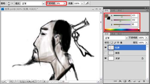 6、把画笔的不透明度设置为50%左右,结合左右中括号键适当的调整笔尖的大小,涂画人物的头发以胡子等,如图6所示。