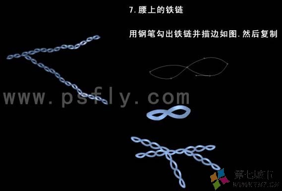 8、制作腰上的铁链,用钢笔勾出铁链并描边如图,然后复制。