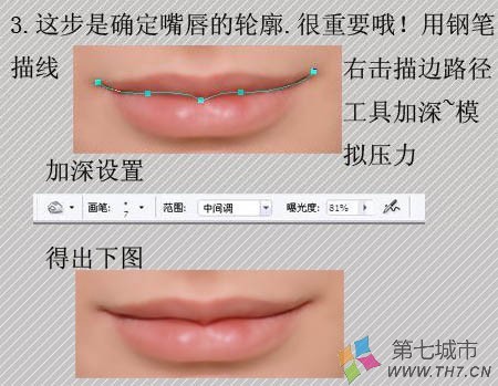 3、这步是确定嘴唇的轮廓,这个很重要。然后选择加深工具参数设置如下图中,用钢笔勾出下图所示的路径,右键选择描边路径,选择加深工具并勾选模拟压力。效果如下图下。