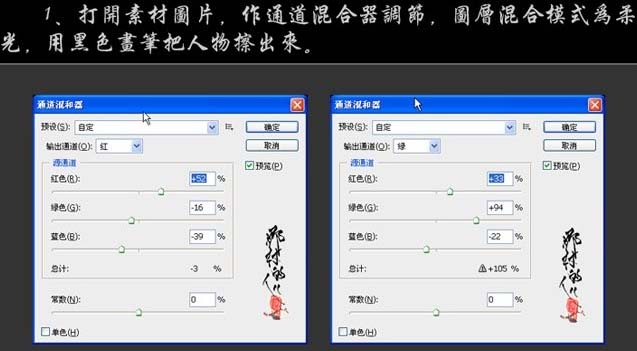 1、打开素材图片,创建通道混合器调整图层,参数设置如下图,确定后把图层混合模式改为“柔光”,用黑色画笔把人物部分擦出来。