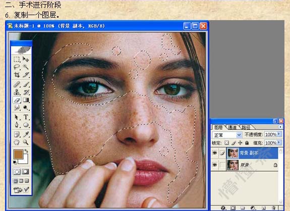 来源:设计中国 作者:懵懂斋 本教程的祛斑方法有点复杂,不过原理大致相同。先把雀斑的大致区域选取出来,适当的模糊处理,然后利用通道及其它滤镜来制作质感。祛斑的方法也很多,可以使用自己的方法去做。 原图 最终效果   1、打开原图素材。 2、把背景图层