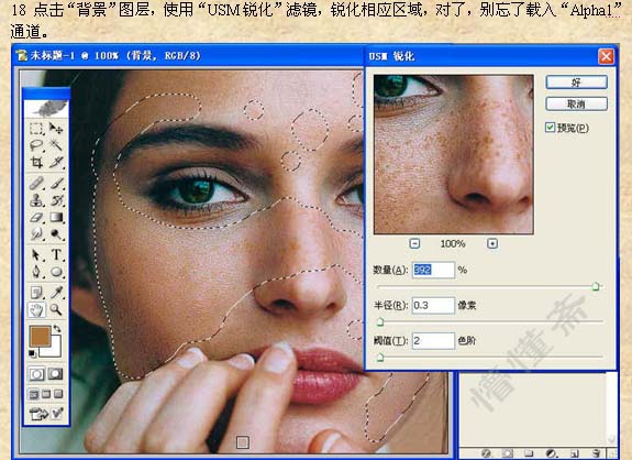18、点击“背景”图层,载入“Alpha1”选区,执行:滤镜 > 锐化 > USM锐化,参数设置如下图。