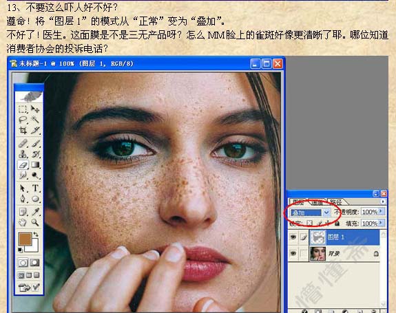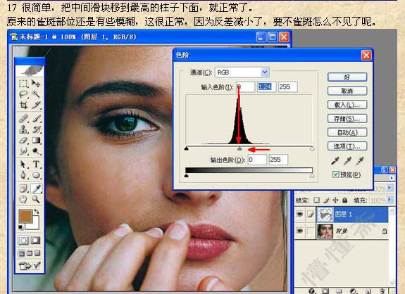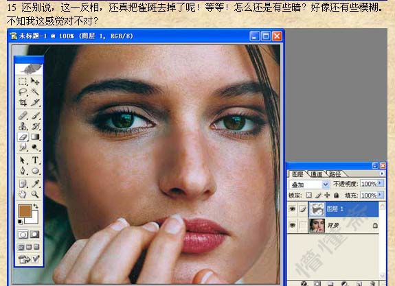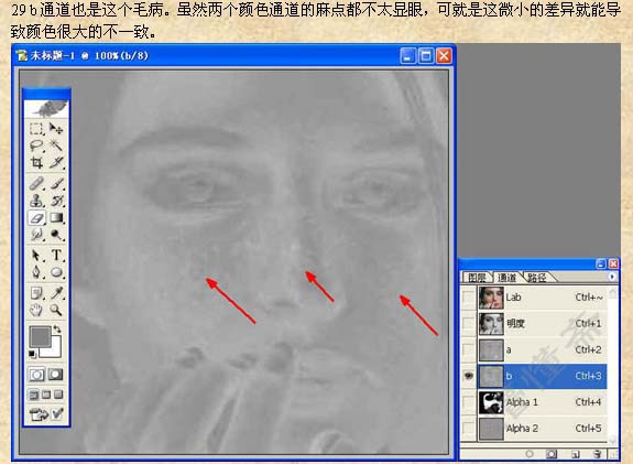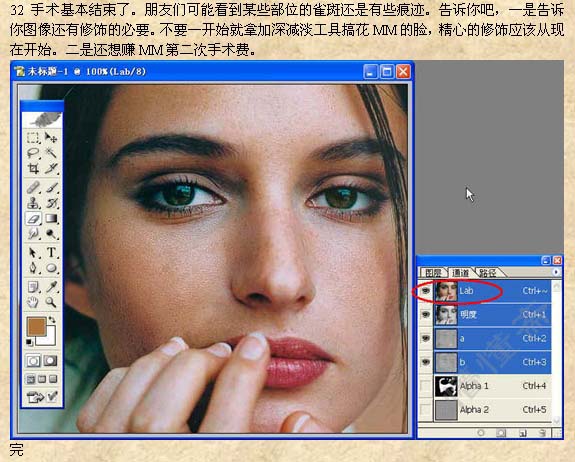 本教程的祛斑方法有点复杂,不过原理大致相同。先把雀斑的大致区域选取出来,适当的模糊处理,然后利用通道及其它滤镜来制作质感。祛斑的方法也很多,可以使用自己的方法去做。