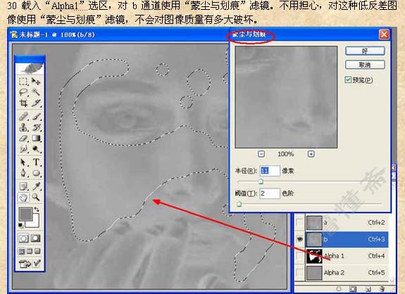30、载入“Alpha1”选区,对b通道执行:滤镜 > 杂色 > 蒙尘与划痕,参数设置如下图。