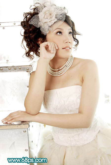 原图素材看上去有点偏色,人物整体感觉有点脏。可能是背景太白,人物质感肤色显示不出来。为了突出肤色,可以给照片加上淡淡的背景,然后把肤色调成跟背景有点对比的色调。这样照片看上去就会清爽很多。