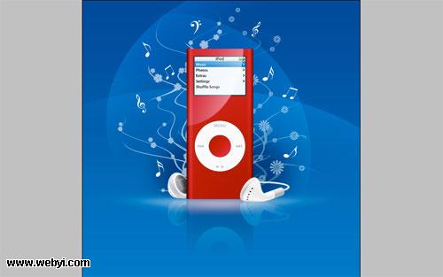 24、昨晚那些后,再一次回到含有ipod图像的图层,载入选区使用选择 >载入选区,接着按下 Ctrl+Shift+I 反选选区。接着转到白色闪耀的图层按下Delete 清除选区。按下 Ctrl+D 取消选区。