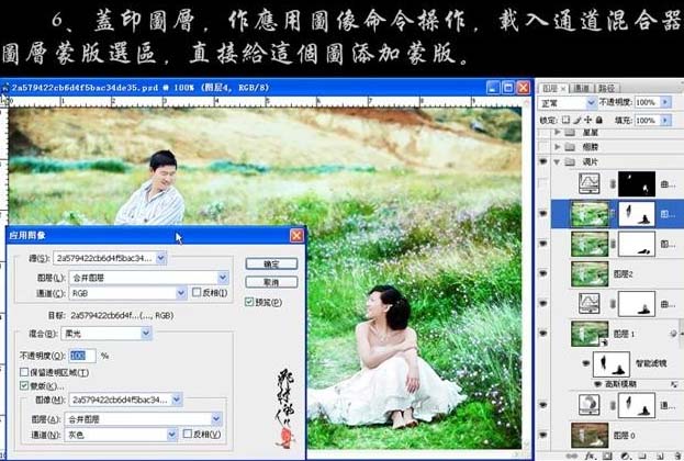 6、新建一个图层,盖印图层,执行:图像 > 应用图像操作,参数设置如下图,载入通道混合器图层蒙版选区,直接给这个图层添加蒙版。