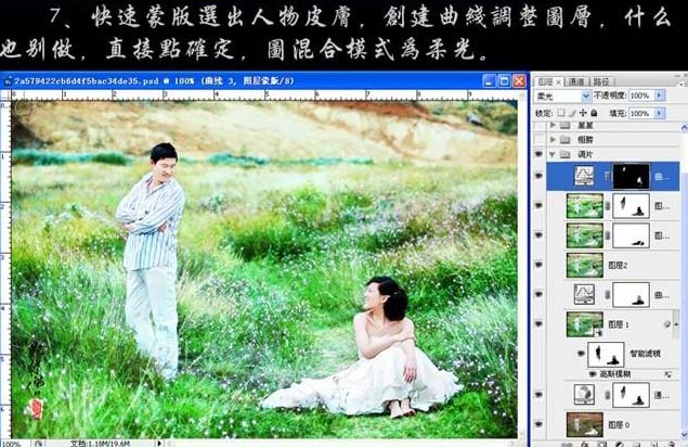 #p# 7、用快速蒙版选出人物皮肤,创建曲线调整图层,什么也不需要调整,确定后把图层混合模式改为“柔光”。