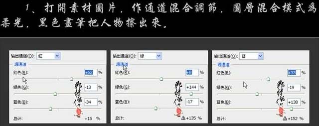 #p# 1、打开原图素材,创建通道混合器调整图层,参数设置如下图,确定后把图层混合模式改为“柔光”,加上图层蒙版用黑色画笔把人物部分擦出来。