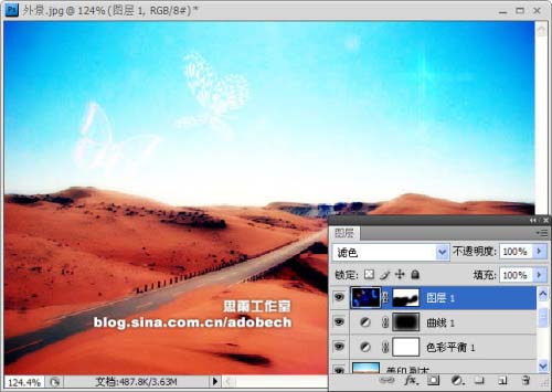 本教程调色非常不错,画面以冷暖对比色为主,鲜艳的沙漠在蓝天的衬托下显示出沙漠特有的景象。而且做作业加入了一些装饰的高光,效果也格外突出 。