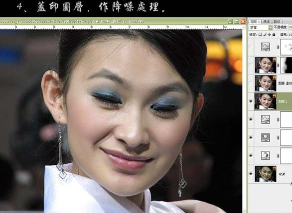 4、新建一个图层,按Ctrl + Alt + Shift + E 盖印图层,给人物磨皮及降噪处理。