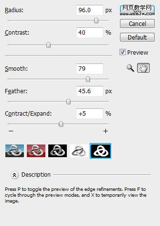 按Ctrl + Alt + R and bring up the Refine Edge tool, 应用如下设置: