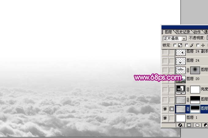 13、打开云彩素材,用魔术棒抠出来,加上渐变色放到人物图层下面,效果如图25。