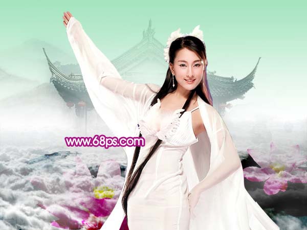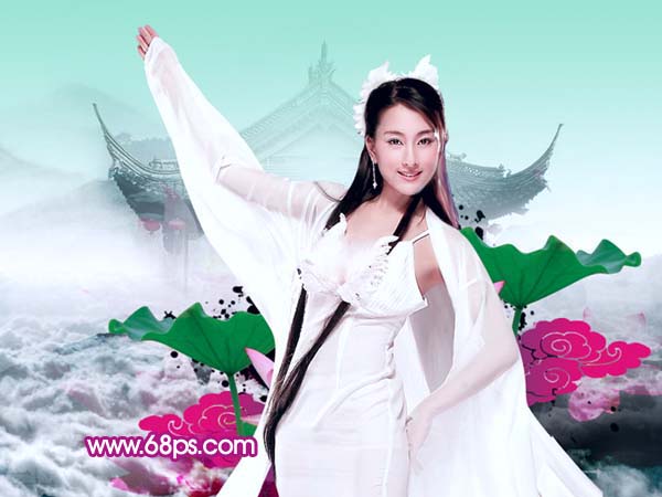 <图21> 12、打开下图所示的荷花素材,用钢笔工具勾出来,放到人物图层的下面,可以多复制几份,效果如图23。