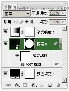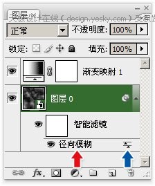 3、通过【图层>智能对象>转换为智能对象】或直接在图层调板中该图层上点击右键后选择“转换为智能对象”。再对其使用【滤镜>模糊>径向模糊】,效果大致如下左图所示。此时的图层调板大致如下右图所示,点击红色箭头处的滤镜名称可调整滤镜参数,点击蓝色箭头处的