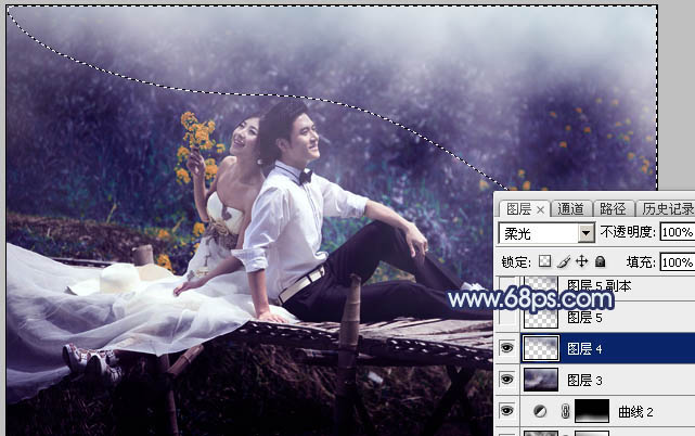 11、用套索工具拉出下图所示的选区,羽化80个像素后按Ctrl + J 把选区部分的图像复制到新的图层,混合模式改为“柔光”,不透明度改为:100%,如下图。