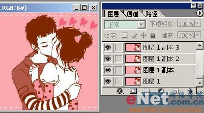 三、复制背景图层三次,在相应的图层上复制并移动心形,得到四个图层[图2],依次增加一颗心[图3];
