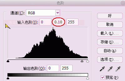 按Ctrl L打开色阶面板, 将RGB通道的第二项值调整为0.10, 两边的值随意. 效果如下图.
