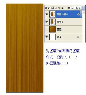2、对图层2副本执行图层样式,投影2,0,2,斜面浮雕2,0。
