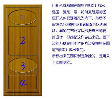 5、用矩形或椭圆选框工具在图层2副本上拉出选区,复制一层,将所复制图层的样式斜面浮雕改为向下。然后不取消选区将图层2和图层2副本选区内删除。屏风的布局可根据自己的爱好设计,但每块都是这样做出来的。最下边的方框是用描边层变换选区后在图层2副本上做出来的。 图上所标出来的四块都是单独的,是用来下部雕刻的。