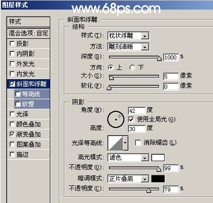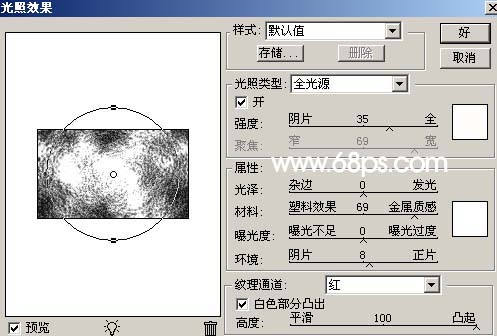 4、执行菜单:滤镜 > 渲染 > 光照效果,参数设置如图4,效果如图5。