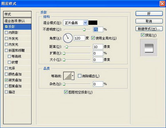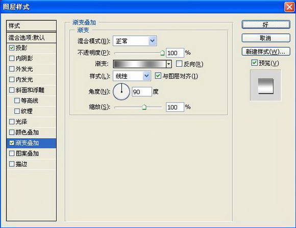 6、双击图层1,在弹出的图层样式对话框中选择“投影”“渐变叠加”样式,在渐变叠加面板中的渐变编辑器中设置色标依次为灰色RGB分别为84、84、84,白色,灰色RGB132、132、132,白色,如图07-08所示,图像效果如图09所示。